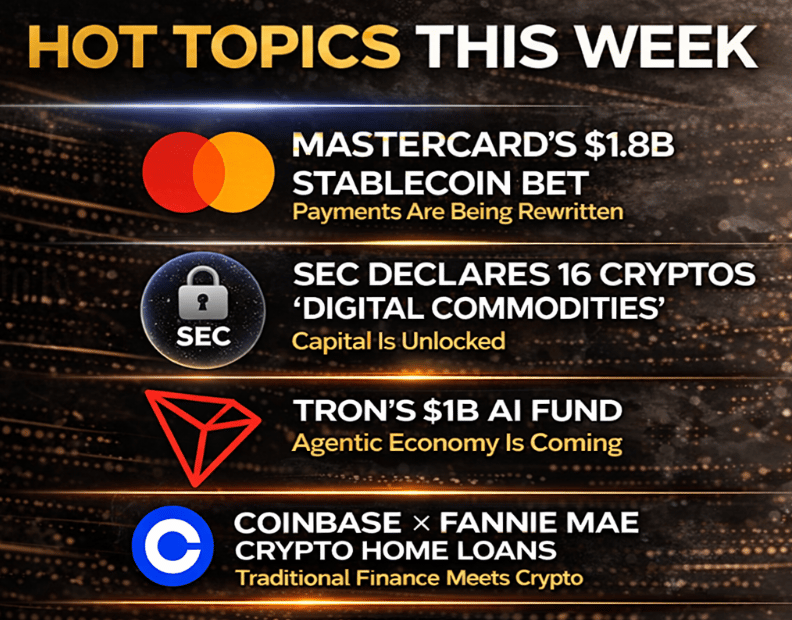 1. Mastercard’s $1.8B Stablecoin Bet: The Future of Payments Is HereThe biggest crypto signal this week didn’t come from crypto… it came from Mastercard. 3. TRON Just 10x’d Its AI Fund: The Rise of the Agentic EconomyTRON just scaled its AI fund from $100 million to $1 BILLION — and it’s betting on autonomous agents. | 2. SEC Declares 16 Cryptos “Digital Commodities”: What This Means for the MarketFor the first time, the SEC is saying these crypto assets are NOT securities — and that changes everything. 4. Coinbase Teams Up with Fannie Mae for Crypto-Backed Home LoansThe crypto giant partners with Better, a Fannie Mae-approved lender in the fintech mortgage space. |